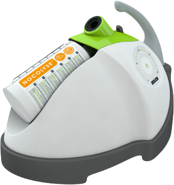Nocospray har en turbin som omvandlar väteperoxid till gas (torrånga). Ångan lämnar maskinen i 80 meter per sekund så den ”trycksätter” hela utrymmet med ångan. Väteperoxiden eliminerar virus, bakterier och sporer. Denna metod kan inte leda till resistensutveckling.